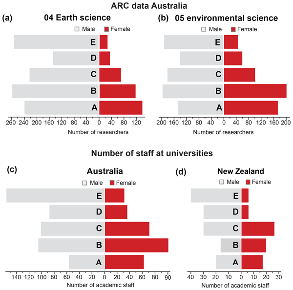 In geoscience classrooms globally there is an approximately even gender split, and this persists into research degrees (honours, masters, PhD). However, as soon as students hit the workforce the number of women begins to decrease, and the drop off is progressively worse at higher levels.